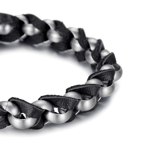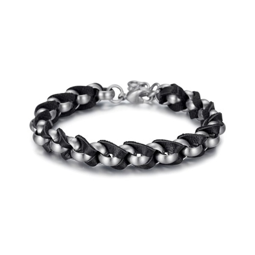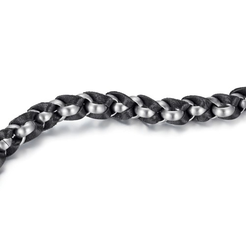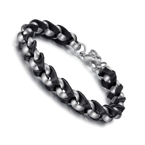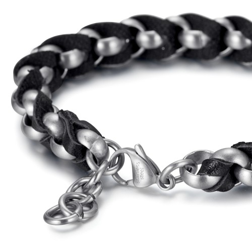 The structure of this bracelet has been braided in stainless steel and leather. A lobster clasp was attached to lock easily. It can be customized with multiple outfits.