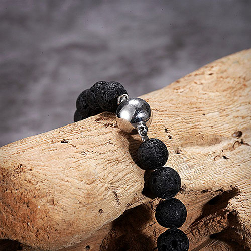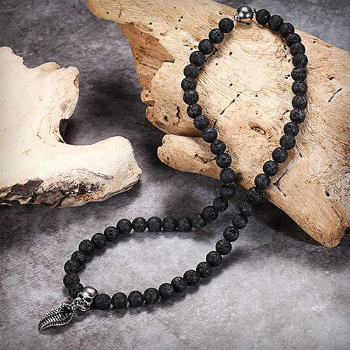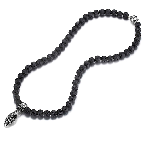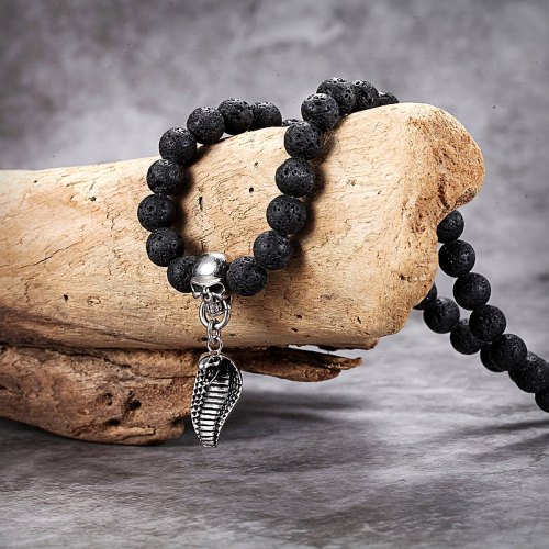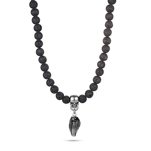 This beaded necklace is strung by striking black lava stone beads with our signature skull and king cobra pendants. The skull and cobra pendants are impeccably crafted from 316 stainless steel. With magnetic clasp for easy wearing.